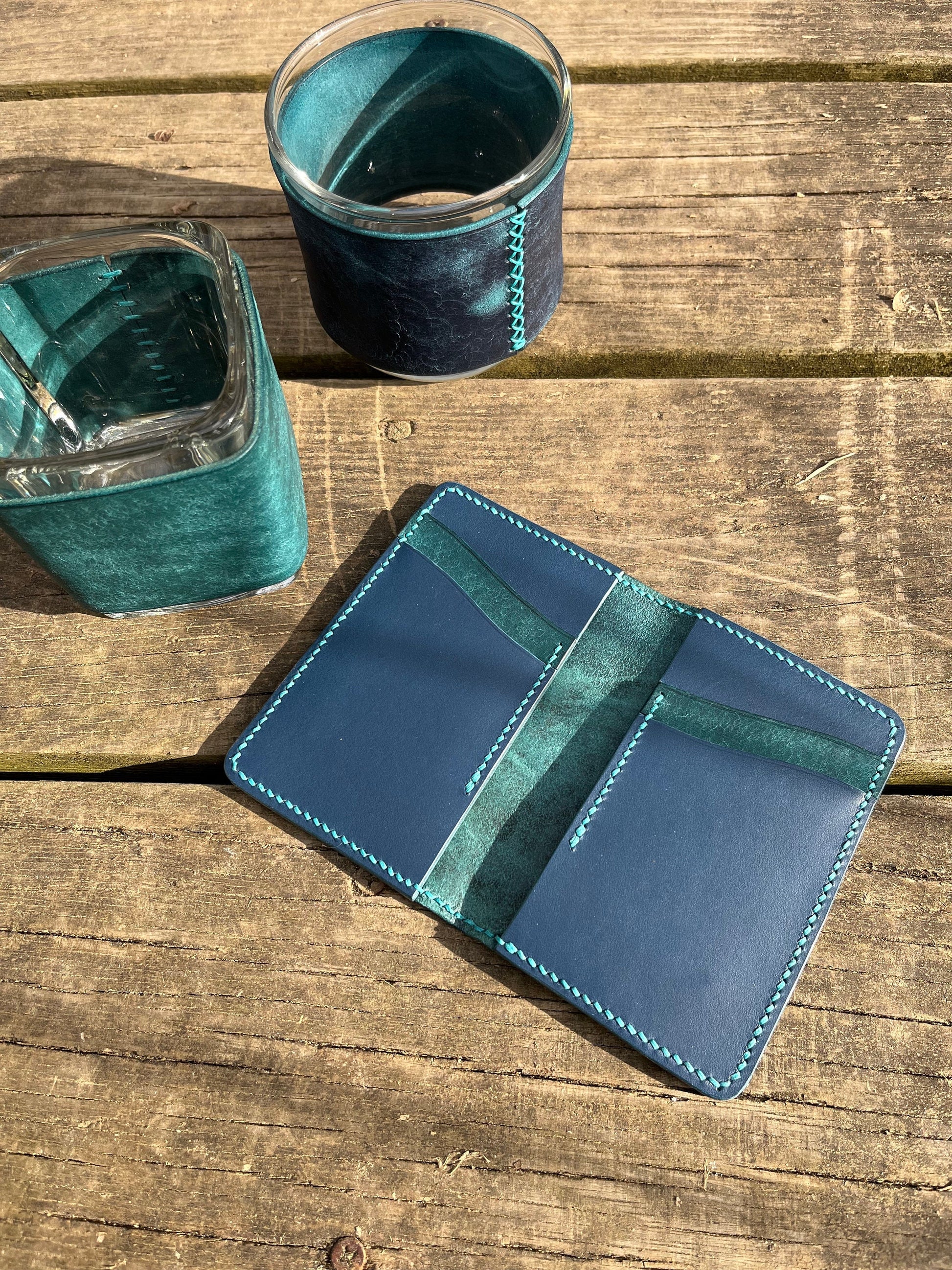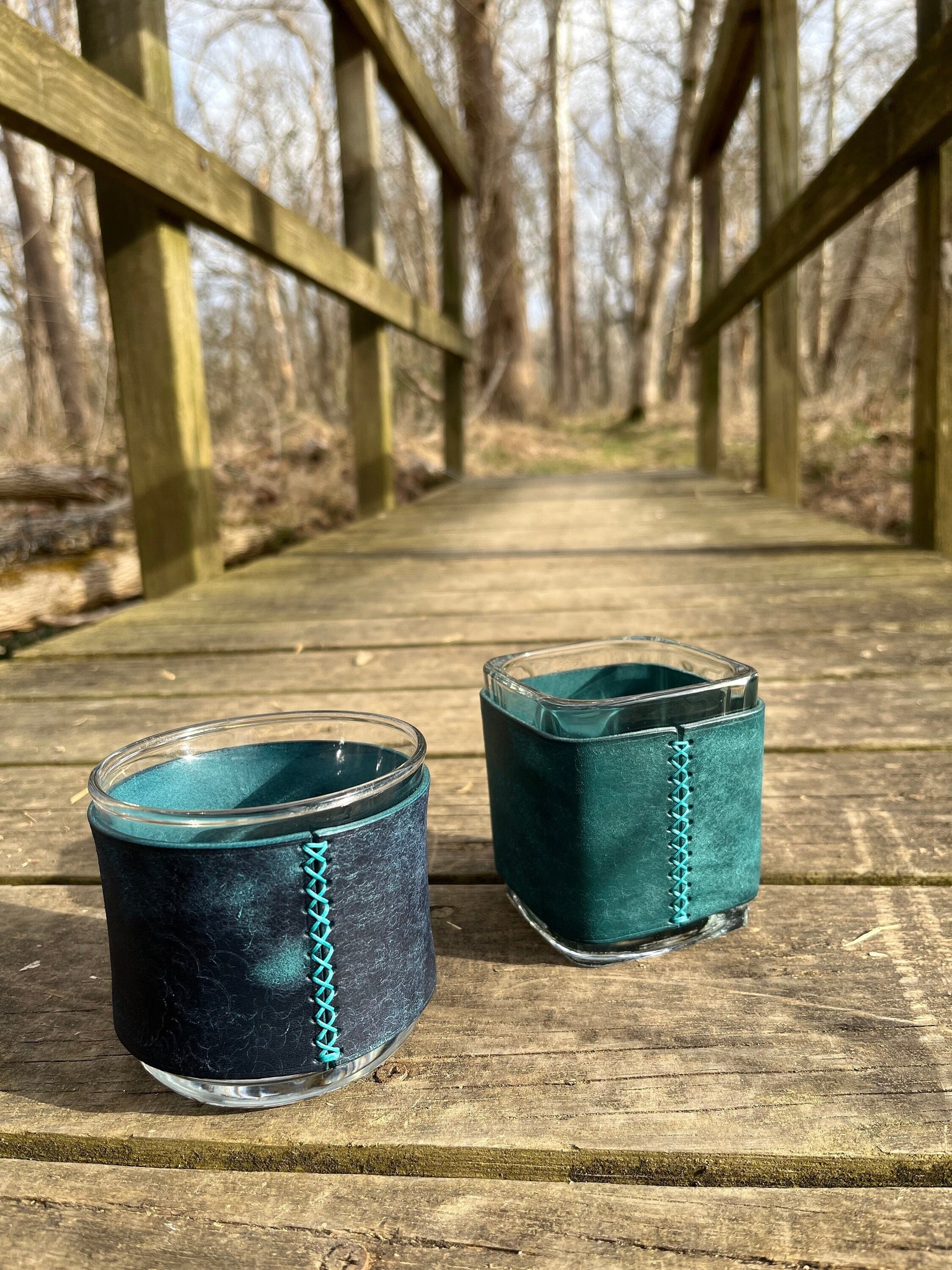 Stunning candle holders with a handmade blue, vegetable tanned, full grain, leather wrap! The wrap is removable, allowing for easy cleaning and maintenance. A teal stitch line runs up one side adding a pop of color and interest. They are unique additions to any room.